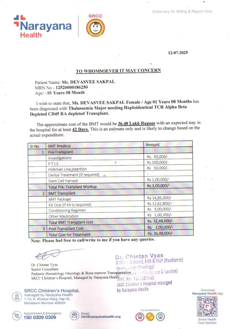 Miss DEVASVEE SAKPAL is battling against Thalassemia Major, and the situation is critical. She is currently admitted at the SRCC Children’s Hospital (Mumbai), under the care of Dr. Chintan Vyas. Devasvee desperately needs Haploidentical TCR Alpha Beta Depleted CD45 RA depleted Transplant to survive, which costs around Rs. 36,48,000 (Thirty-six lakh and forty-eight thousand only). At just 01 year 08 Months old, she is battling with such a serious illness. Also, the family is very poor and survives on the daily wages of her father. This is a very helpless situation for the family. Along with the treatment, the doctors have also advised supportive care, blood products, hospitalisations, and investigations. Your generosity can make a life-saving difference. Your contribution, no matter how small, will be a ray of hope for her family during this dark time. Help us resolve their financial burden and give them a chance they desperately need. Please be kind and join us in this noble cause.