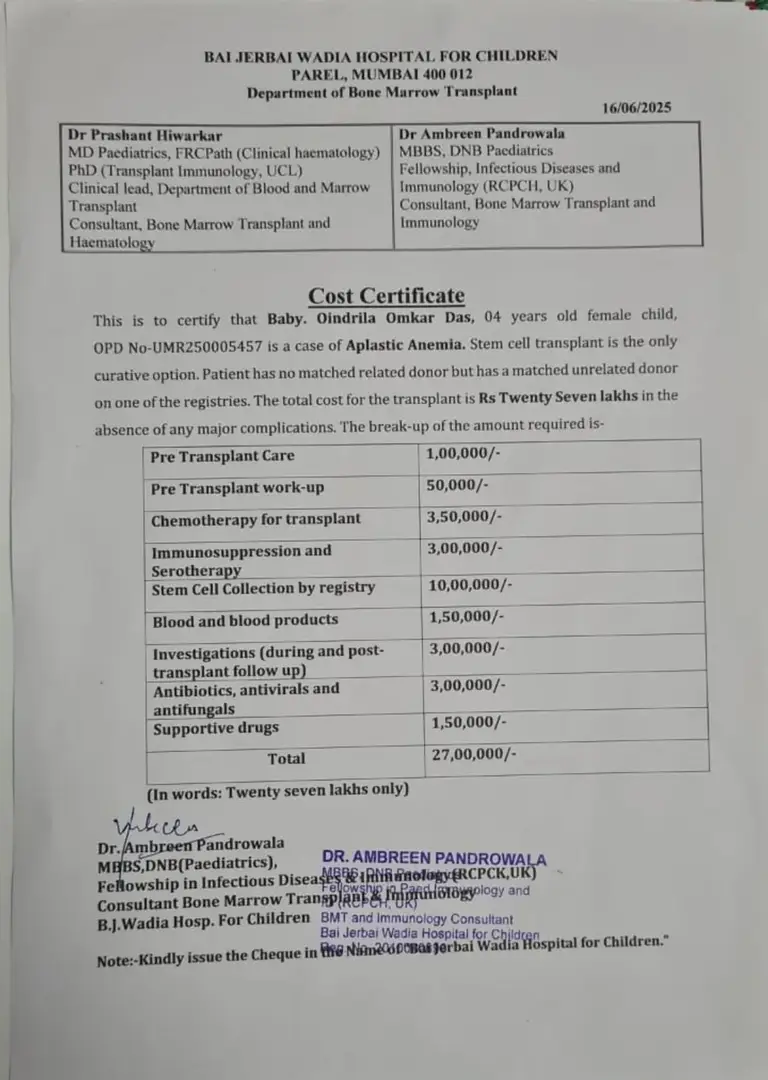 Miss Oindrila Omkar Das is battling against Aplastic Anemia, and the situation is critical. She is currently admitted at the Bai Jerabai Wadia Hospital For Children Parel, Mumbai under the care of Dr. Ambreen Pandrowala. Oindrila desperately needs Stem cell transplant to survive, which costs around Rs. 27,00,000/- (Twenty seven lakhs only). At just 4 Years old, she is battling with such a serious illness. Also, the family is very poor and survives on the daily wages of her father. This is a very helpless situation for the family. Along with the treatment, the doctors have also advised supportive care, blood products, hospitalisations, and investigations. Your generosity can make a life-saving difference. Your contribution, no matter how small, will be a ray of hope for her family during this dark time. Help us resolve their financial burden and give them a chance they desperately need. Please be kind and join us in this noble cause.