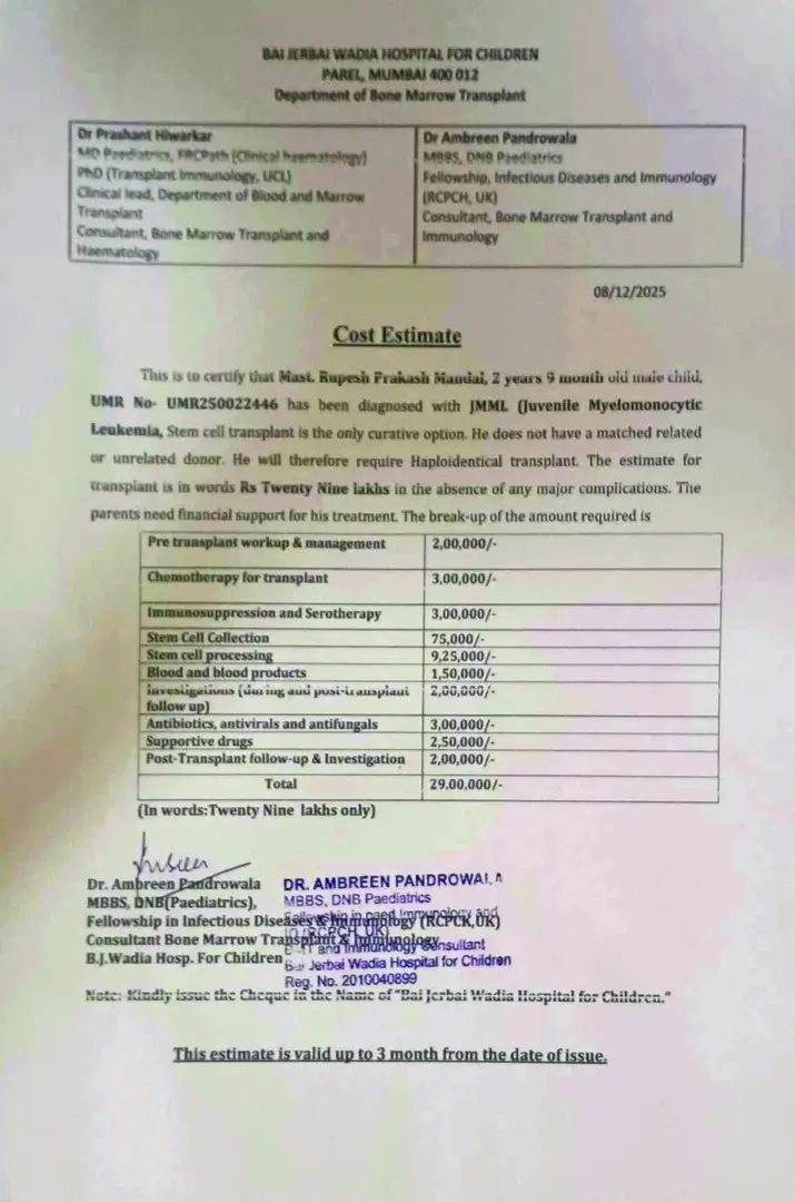 Master Rupesh Prakash Mandal is battling against Juvenile Myelomonocytic Leukemia, and the situation is critical. He is currently admitted at the Bai Jerbai Wadia Hospital for Children, Mumbai, under the care of Dr Ambreen Pandrowala. Rupesh desperately needs a Stem cell transplant to survive, which costs around Rs. 29,00,000/-(Twenty Nine Lakh Only). At just 2.9 years old, he is battling with such a serious illness. Also, the family is very poor and survives on the daily wages of his father. This is a very helpless situation for the family. Along with the treatment, the doctors have also advised supportive care, blood products, hospitalisations, and investigations.