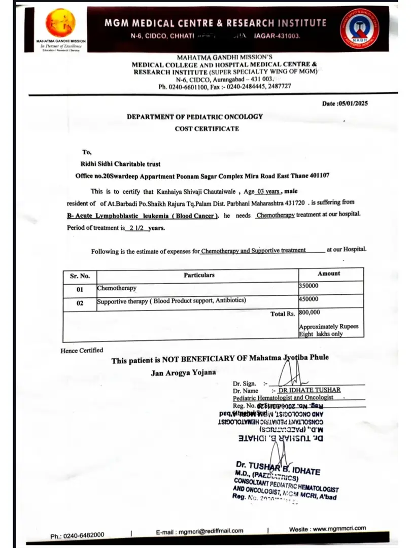 Master Kanhaiya Shivaji Chautaiwale is battling against B- Acute Lymphoblastic leukemia (Blood Cancer), and the situation is critical. He is currently admitted at the MGM MEDICAL CENTRE & RESEARCH INSTITUTE, CHHATRAPATI SAMBHAJINAGAR. under the care of Dr. TUSHAR B. IDHATE. Kanhaiya desperately needs Chemotherapy to survive, which costs around Rs. 8,00,000/- (Eight lakhs only). At just 3 Year old, he is battling with such a serious illness. Also, the family is very poor and survives on the daily wages of his father. This is a very helpless situation for the family. Along with the treatment, the doctors have also advised supportive care, blood products, hospitalisations, and investigations.