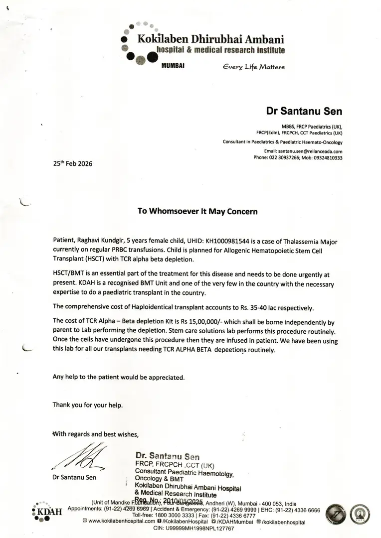 Miss Raghavi Dhanraj Kundgir is battling against Thalassemia Major, and the situation is critical. She is currently admitted at the Kokilaben Dhirubhai Ambani Hospital & Medical Research Institute Mumbai under the care of Dr. Santanu Sen. Raghavi desperately needs Allogenic Hematopoietic Stem Cell Transplant (HSCT) to survive, which costs around Rs. 40,00,000/- (Forty Lakhs only). At just 5 Year old, She is battling with such a serious illness. Also, the family is very poor and survives on the daily wages of her father. This is a very helpless situation for the family. Along with the treatment, the doctors have also advised supportive care, blood products, hospitalisations, and investigations.
