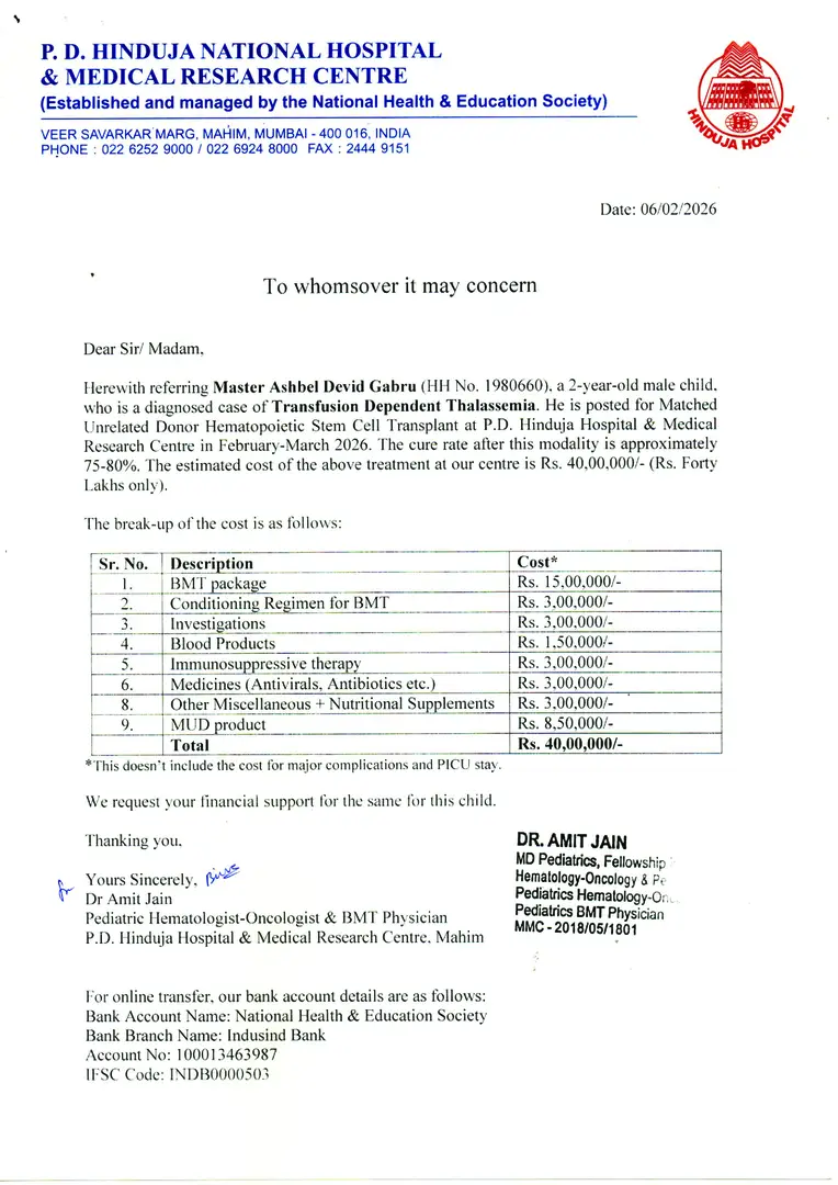Master Ashbel Devid Gabru is battling against Transfusion Dependent Thalassemia, and the situation is critical. He is currently admitted at the P. D. HINDUJA NATIONAL HOSPITAL & MEDICAL RESEARCH CENTRE, MUMBAI, under the care of Dr. Amit Jain. Ashbel desperately needs Matched Unrelated Donor Hematopoietic Stem Cell Transplant to survive, which costs around Rs. 40,00,000/- (Forty Lakhs only). At just 2 Year old, he is battling with such a serious illness. Also, the family is very poor and survives on the daily wages of his father. This is a very helpless situation for the family. Along with the treatment, the doctors have also advised supportive care, blood products, hospitalisations, and investigations.
